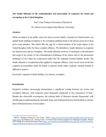 While corruption in the public sector has been covered widely, corporate tax fraud/evasion, tax related fraud enabling corruption or tax corruption enabling fraud in the private sector have been given scant attention. This article fills this gap by a critical analysis of the legal regime in the United Kingdom (UK) for these complex offences. We identified a triadic dilemma in corporate tax fraud/evasion and tax corruption. The triadic dilemma involves (1) ambiguity in the definition and scope of tax crimes (2) the criminalisation challenges of tax crimes and (3) the prosecution challenges of tax crimes for corporations under the UK corporate criminal liability model. The triadic dilemma is complicated when applied to corporate offences, since recent cases reveal that corporate accountability under the failure to prevent model under corporate criminal liability is difficult to achieve.