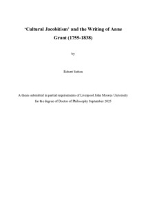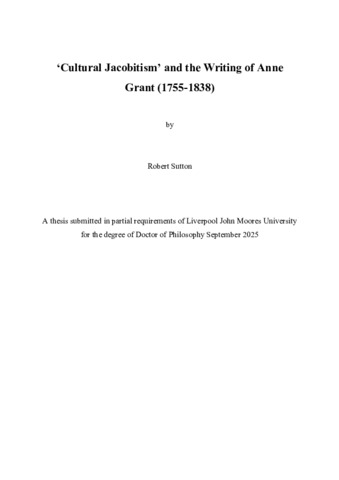 This thesis has two principal aims. The first is to continue and develop recent work recuperating the writing of Anne MacVicar Grant (1755-1838). (Perkins 2022; McNeil 2020). My second, and related aim is to frame both Grant’s writing and personal identity as an expression of a philosophy that I have termed ‘Cultural Jacobitism’. Cultural Jacobitism is defined by the thesis as distinguishable from both the political and dynastic struggle leading up to 1746, which had been largely confined to history in Grant’s lifetime because of the failed insurrection. It also differs from the sentimental and nostalgic strain of Jacobitism that emerged after 1746, in the work of Walter Scott and others in that where such a conventional history often represented the inevitability of Jacobitism’s demise, Grant offers an alternative interpretation of history that both recuperates and retains certain ideological and cultural elements. While such elements were deemed retrograde and discarded in the wake of the Enlightenment, Grant presents them as a remedy for many of the issues impacting her contemporary modern world. The thesis necessarily investigates Grant’s contemporary popularity and success as an author, as a peer of Scott and other writers of her milieu. It also addresses the subsequent decline of her reputation and neglect in literary history, and builds on recent scholarly articles, chapters, and editions that have begun to redress this neglect (Shields 2012; Hagglund 2017) .The absence of a modern critical monograph on Grant’s oeuvre as a whole belies both the extent of her influence and the importance of her interventions in Enlightenment discourse during the early nineteenth century. This thesis aims to address this absence, not only by exploring Grant’s published works but also by making use of various unpublished manuscripts. Conveying her experiences through different literary genres, Grant’s writing not only straddles generic forms but invites inter- and cross-disciplinary approaches between literary studies, history, and social sciences. I also suggest that even within modern efforts of the recuperation of women writers of the long nineteenth century, Grant’s relative marginalisation highlights how she operated outside of conventional classifications of identity. An important part of Grant’s authorial identity is the combination of lived experience of both the Gaelic-speaking Scottish Highlands and her childhood in proximity to various marginalised, indigenous and colonial antebellum communities in America. The thesis demonstrates the importance of Grant’s anthropological approach to the merits and vulnerabilities of the societies she observed, and how it was focused through the strengths and insecurities of her own identity. In summary, through an exploration of Grant’s complex orientation towards issues such as nationality and nationalism, politics, gender, and religion, and the consolidation of these issues under the concept of Cultural Jacobitism, I offer an overall reconsideration of how her literary identity and oeuvre can be understood.