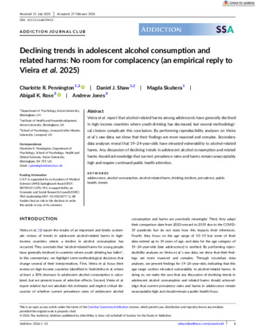Vieira et al. report that alcohol-related harms among adolescents have generally declined in high-income countries where youth drinking has decreased, but several methodological choices complicate this conclusion. By performing reproducibility analyses on Vieira et al.'s raw data, we show that their findings are more nuanced and complex. Secondary data analyses reveal that 19–24-year-olds have elevated vulnerability to alcohol-related harms. Any discussion of declining trends in adolescent alcohol consumption and related harms should acknowledge that current prevalence rates and harms remain unacceptably high and require continued public health attention.