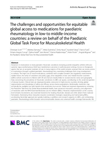Scott, C, Slamang, W, Dushnicky, M, Hause, E, Faleye, A, Furia, F, Cuevas, OA, Hadef, D, Munro, J, Nzabonimpa, C, Foster, H, Migowa, A and Paediatric Global Task Force for Musculoskeletal Health (2026) The challenges and opportunities for equitable global access to medications for paediatric rheumatology in low-to middle-income countries: a review on behalf of the Paediatric Global Task Force for Musculoskeletal Health. Arthritis Research & Therapy, 28. ISSN 1478-6354