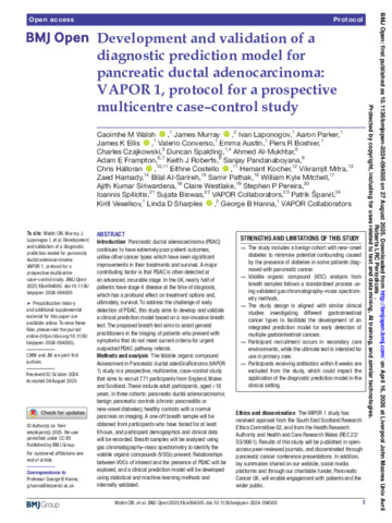 Ethics and dissemination The VAPOR 1 study has received approval from the South East Scotland Research Ethics Committee 02, and from the Health Research Authority and Health and Care Research Wales (REC 22/SS/0061). Results of this study will be published in open-access peer-reviewed journals, and disseminated through pancreatic cancer conference presentations. In addition, lay summaries shared on our website, social media platforms and through our charitable funder, Pancreatic Cancer UK, will enable engagement with patients and the wider public.