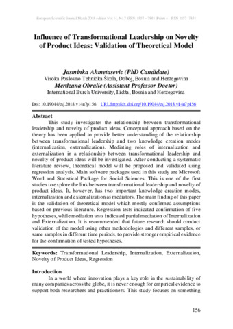 Ahmetasevic, J and Obralic, M (2018) Influence of Transformational Leadership on Novelty of Product Ideas: Validation of Theoretical Model. European Scientific Journal, 14 (7). p. 156. ISSN 1857-7881