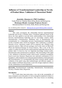 This study investigates the relationship between transformational leadership and novelty of product ideas. Conceptual approach based on the theory has been applied to provide better understanding of the relationship between transformational leadership and two knowledge creation modes (internalization, externalization). Mediating roles of internalization and externalization in a relationship between transformational leadership and novelty of product ideas will be investigated. After conducting a systematic literature review, theoretical model will be proposed and validated using regression analysis. Main software packages used in this study are Microsoft Word and Statistical Package for Social Sciences. This is one of the first studies to explore the link between transformational leadership and novelty of product ideas. It, however, has two important knowledge creation modes, internalization and externalization as mediators. The main finding of this paper is the validation of theoretical model which mostly confirmed assumptions based on previous literature. Regression tests indicated confirmation of five hypotheses, while mediation tests indicated partial mediation of Internalization and Externalization. It is recommended that future research should conduct validation of the model using other methodologies and different samples, or same samples in different time periods, to provide stronger empirical evidence for the confirmation of tested hypotheses.